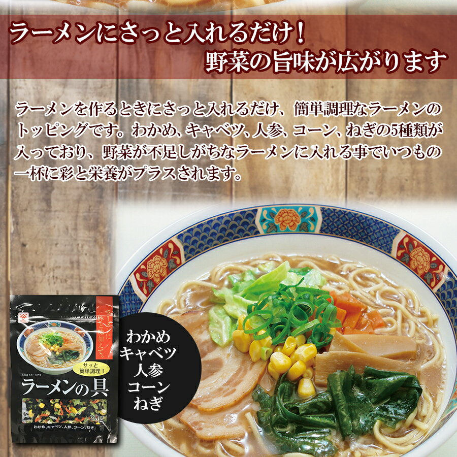 わかめ、キャベツ、人参、コーン、ねぎの5種類が入っており、野菜が不足しがちなラーメンに入れる事でいつもの一杯に彩と栄養がプラスされます。
